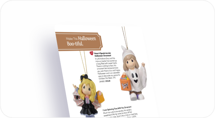 Make This Halloween Boo-tiful. NEW Have A Spook-tacular Halloween Ornament It is All Hallows Eve, and this trick-or-treater has scared up a bag filled with sweet treats. There is nothing to fear, this ornament lets someone know you wish them a fun and happy Halloween and is an adorable way to decorate any space for October 31st. Resin. 3"H. 241406 | $15.00 I Love Spinning Time With You Ornament Much too cute to be spooky, this spidery sweetheart lifts her arms to show off her spiderweb cape. Tuck it into a trick-or-treat bag or hang from a Halloween tree. Resin. 3.25"H. 231402 | $15.00 Have A Purr-fect Halloween Candy Corn Kisses And Trick Or Treat, You’re So Ornament Halloween Wishes Ornament Sweet Ornament Resin. 3.25"H. You’re Boo-tiful Ornament Resin. 3.25"H. Resin. 3.25"H. 211404 | $15.00 Resin. 3.25"H. 221402 | $15.00 211403 | $15.00 211402 | $15.00 6 PreciousMoments.com | 866-336-2554