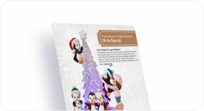 These Penguins Make Christmas Oh So Special. Tree-mendous Fun Lighted Figurine This sweet girl and her penguin friends inspire fond memories of untangling lights and placing that treasured star on top of the tree. With mesmerizing colors and dazzling lights, this figurine makes the perfect gift for nearly anyone on your holiday list. Resin/Acrylic. Includes 3 button cell batteries. 7.5"H. 171413 | $45.00 NEW We Make A Cool Team Figurine A pair of penguins constructs an igloo, working together to place each block just so. Wearing hats and scarves, they are plenty warm all while making a very cool team. Add a touch of winter whimsy to any décor with this fabulous, feathered duo! Bisque porcelain. 4.75"H. 231045 | $50.00 NEW It’s The Season For Freezin’ Ornament Sitting on a block of frozen ice, this penguin is loving the chilly season! There is no doubt he will warm the heart of anyone, no matter the weather. Bisque porcelain. 3.5"H. 26 PreciousMoments.com | 866-336-2554 231046 | $30.00