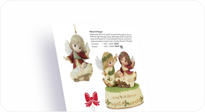 “Away In A Manger” Angels were the first to herald the arrival of the newborn king on that holy night long ago. These uplifting gifts of faith combine the colors and themes of a Christ-centered Christmas. Ornament is bisque porcelain; musical is resin and plays “Away In A Manger”. Ornament | 3.5"H. | 231037 | $35.00 Musical | 4.5"H. | 231403 | $50.00 NEW An Angelic Touch Ornament Once the star is on top of the tree it really feels like Christmas! Wearing halos of holly and robes with golden trim, these angels lift a golden star. It makes a thoughtful gift for someone who loves angels and is a beautiful addition to any holiday tree. Bisque porcelain. 3.25"H. 241030 | $35.00 An Angelic Touch Figurine A beautiful Christmas angel places a golden star upon an outdoor Christmas tree. Naturally decorated with pinecones, holly leaves, and berries, this figurine showcases winter’s beauty. Bisque porcelain. 5.5"H. 239037 Exclusive | $75.00 37
