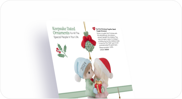 Keepsake Dated NEW Our First Christmas Together Dated Couple Ornament For All The Honor a couple’s first Christmas with Ornaments this adorable pair who shares a Special People In Your Life. smooch beneath the mistletoe. They may not need a reason to indulge in a holiday kiss, but the mistletoe makes it more fun! The “2024” upon his hat commemorates this special year. Bisque porcelain. 3.25"H. 241004 | $35.00 NEW Baby’s First Christmas Dated Ornament Mark their first Christmas with an ornament the whole family will cherish forever. These commemorative ornaments feature precious babies bundled in their warmest pajamas and wearing stocking hats proclaiming it is “Baby’s 1st Christmas”. Each snuggles a wintry friend with “2024” on their hat. Bisque porcelain. 2.75"H. Girl | 241005 | $30.00 Boy | 241006 | $30.00 4 PreciousMoments.com | 866-336-2554