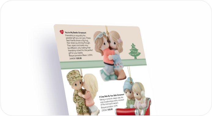 NEW You’re My Bestie Ornament Friendship is arguably the greatest gift you can give. These best friends share a big hug, their sheer joy shining through. Their styles and tastes may be different, only making their friendship richer! It is the perfect gift for your bestie. Bisque porcelain/Resin. 3.25"H. 241409 | $35.00 A Cozy Ride By Your Side Ornament Taking a romantic sleigh ride, this cozy couple enjoys every moment of the most joyful season. Bisque porcelain. 3.5"H. 231034 | $35.00 You Are The Hero Of My Heart Ornament A thoughtful gift for someone in the military and for all those that love them. Bisque porcelain. 3.25"H. 229003 Exclusive | $35.00 You’re The Only Fish In My Sea Ornament Bisque porcelain. 2.75"H. 229004 Exclusive | $35.00 Our Love Is Deeper Than The Ocean Ornament Bisque porcelain. 3.25"H. 229002 Exclusive | $35.00 31