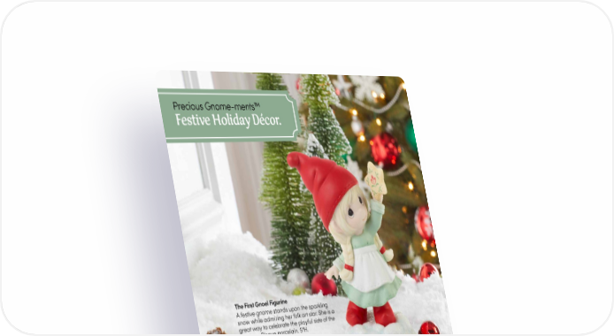 Precious Gnome-ments™ Festive Holiday Décor. The First Gnoel Figurine A festive gnome stands upon the sparkling snow while admiring her folk art star. She is a great way to celebrate the playful side of the holidays. Bisque porcelain. 5"H. 231044 | $45.00 Contents not included. Gnome Worry, Be Happy Ornament This adorable gnome strings a strand of Christmas bulbs to brighten the season. A whimsical addition to any tree, it features festive Christmas colors and a drift of glittering snow. Bisque porcelain. 4"H. 231032 | $30.00 I’ll Be Gnome For Christmas Figurine There is “gnome” place like home for the holidays! While Santa has his sleigh, this gnome won’t be outdone as he makes his trip on a bright red scooter. Bisque porcelain. 5.25"H. 221037 | $55.00 14 PreciousMoments.com | 866-336-2554