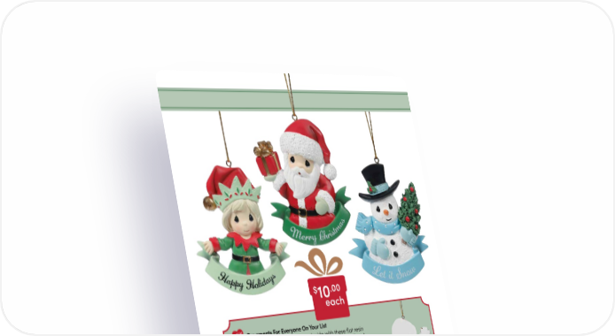 $ .00 10 each NEW Ornaments For Everyone On Your List Spread holiday cheer far and wide with these flat resin ornaments. Perfect for giving as a gift. "To" and "From" printed on the back for easy personalization. Resin. 2.75"H. Happy Holidays Elf | 241420 Merry Christmas Santa | 241418 Personalize Let It Snow Snowman | 241419 the back! Peace On Earth Angel | 241421 The First Noel Nativity | 241422 Season's Greetings Reindeer | 241425 32 PreciousMoments.com | 866-336-2554