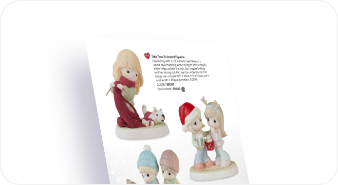 NEW Take Time To Unwind Figurine Unwinding with a cat in the house takes on a whole new meaning when trying to knit! A playful kitten helps as best she can, but maybe knitting isn’t her strong suit. Her human understands that things can unravel with a feline in the house, but it is all worth it. Bisque porcelain. 5.25"H. 241036 | $50.00 Personalized | $56.00 You’re A Deer Friend Figurine Eager to exchange their holiday gifts, these two friends know that no present is more valuable than the friendship they share. Bisque porcelain. 6"H. 231040 | $75.00 Personalized | $81.00 A Winter Walk Is Warmer With You Figurine Crunching through the snow, this couple has met a friendly fawn on their walk. This figurine lets someone know you will gladly stroll hand-in-hand with them during any season. Bisque porcelain. 6"H. 231038 | $85.00 NEW Share The Magic Of Christmas Musical Snow Globe On her way to share some Christmas magic, this sweet girl pulls her wagon trimmed in lights, hauling a decorated tree. This darling messenger makes a festive addition to any holiday décor. Plays “O Tannenbaum”. Resin/Glass. 4"H. 231404 | $50.00 28 PreciousMoments.com | 866-336-2554