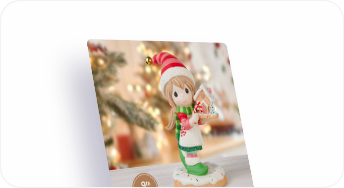 9th in Series NEW A Christmas Treat For Someone Sweet The 9th figurine and ornament introductions in the Annual Elf Series feature an elf who has created something super sweet for someone special – a scrumptious gingerbread treat. With a jingle bell on her hat, this jolly helper honors a long-standing baking tradition. Bisque porcelain. Ornament | 3.75"H. | 241014 | $35.00 Figurine | 5.5"H. | 241013 | $55.00 12 PreciousMoments.com | 866-336-2554