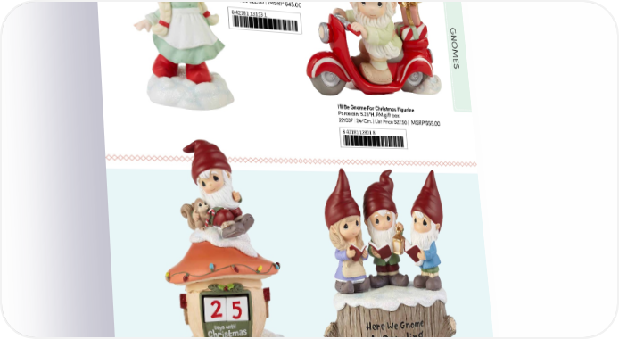 The First Gnoel Figurine Porcelain. 5"H. PM gift box. 231044 | 40/Ctn. List Price $22.50 | MSRP $45.00 8 42181 13113 1 GNOMES I’ll Be Gnome For Christmas Figurine Porcelain. 5.25"H. PM gift box. 221037 | 24/Ctn. | List Price $27.50 | MSRP $55.00 8 42181 12801 8 Gnome Sweet Gnome For The Holidays Countdown Calendar Here We Gnome A-Caroling Musical Resin. 6"H. PM gift box. MSRP $40.00 Plays “Here We Come A-Caroling”. 221403 | 12/Ctn. | List Price $20.00 | Resin. 5.5"H. PM gift box. MSRP $50.00 8 42181 12771 4 221107 | 12/Ctn. | List Price $25.00 | 8 42181 12770 7 41