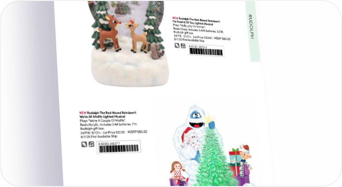 RUDOLPH NEW Rudolph The Red-Nosed Reindeer® I’m Fawn’d Of You Lighted Musical Plays “Holly Jolly Christmas”. Resin/Glass. Includes 3 AAA batteries. 6.5"H. Rudolph gift box. MSRP $60.00 241718 | 12/Ctn. | List Price $30.00 | 8/1/25 First Available Ship 8 42181 14125 3 NEW Rudolph The Red-Nosed Reindeer® We’re All Misfits Lighted Musical Plays “We’re A Couple Of Misfits”. Resin/Acrylic. Includes 3 AA batteries. 7"H. Rudolph gift box. MSRP $65.00 241719 | 6/Ctn. | List Price $32.50 | 8/1/25 First Available Ship 8 42181 14127 7 Rudolph The Red-Nosed Reindeer® You’re Cute Ornament Resin. 2.75"H. Rudolph window gift box. 241723 | 48/Ctn. | List Price $5.00 | MSRP $10.00 Rudolph the Red-Nosed Reindeer © & ®/™ The Rudolph Co., L.P. All elements under license to Character Arts, LLC. All rights reserved. 53