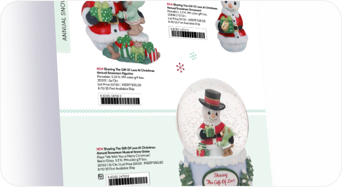 16th in Series MAN NEW Sharing The Gift Of Love At Christmas W Annual Snowman Ornament Porcelain. 3.5"H. PM color gift box. 251016 | 72/Ctn. List Price $17.50 | MSRP $35.00 SNO 6/15/25 First Available Ship AL 8 42181 14757 6 ANNU NEW Sharing The Gift Of Love At Christmas Annual Snowman Figurine Porcelain. 5.25"H. PM color gift box. 251015 | 24/Ctn. MSRP $55.00 List Price $27.50 | 6/15/25 First Available Ship 8 42181 14758 3 NEW Sharing The Gift Of Love At Christmas Annual Snowman Musical Snow Globe Plays “We Wish You a Merry Christmas”. Resin/Glass. 5.5"H. PM color gift box. MSRP $50.00 251102 | 12/Ctn. | List Price $25.00 | 6/15/25 First Available Ship 8 42181 14759 0 8