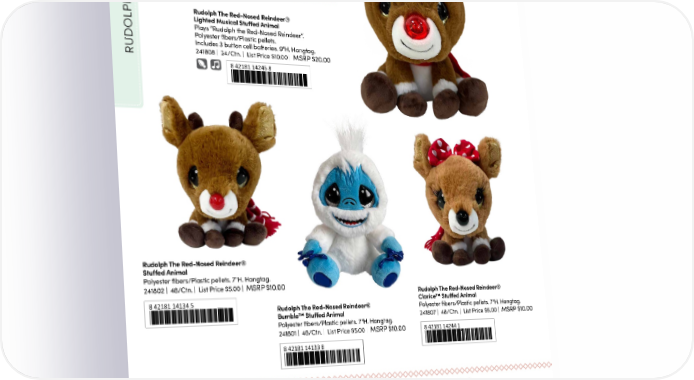 His nose lights up as he plays “Rudolph the Red-Nosed Reindeer” Rudolph The Red-Nosed Reindeer® Lighted Musical Stuffed Animal Plays “Rudolph the Red-Nosed Reindeer”. Polyester fibers/Plastic pellets. Includes 3 button cell batteries. 9"H. Hangtag. RUDOLPH 241808 | 24/Ctn. | List Price $10.00 | MSRP $20.00 8 42181 14245 8 Rudolph The Red-Nosed Reindeer® Stuffed Animal Polyester fibers/Plastic pellets. 7"H. Hangtag. 241802 | 48/Ctn. | List Price $5.00 | MSRP $10.00 Rudolph The Red-Nosed Reindeer® 8 42181 14134 5 Clarice™ Stuffed Animal Rudolph The Red-Nosed Reindeer® Polyester fibers/Plastic pellets. 7"H. Hangtag. Bumble™ Stuffed Animal 241807 | 48/Ctn. | List Price $5.00 | Polyester fibers/Plastic pellets. 7"H. Hangtag. MSRP $10.00 241801 | 48/Ctn. | List Price $5.00 | 8 42181 14244 1 MSRP $10.00 8 42181 14133 8 Rudolph The Red-Nosed Reindeer® 12pc Plush Pre-pack Includes 6 Rudolph®, 3 each Clarice™ and Bumble™ 24961 | 4/Ctn. | List Price $60.00 | MSRP $119.88 8 42181 14494 0 54 Rudolph the Red-Nosed Reindeer © & ®/™ The Rudolph Co., L.P. All elements under license to Character Arts, LLC. All rights reserved.