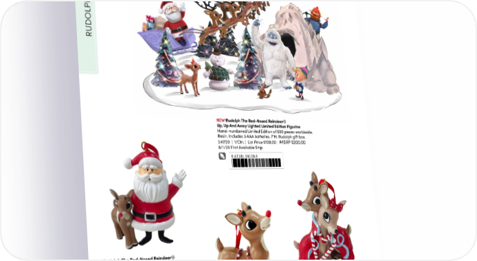 RUDOLPH NEW Rudolph The Red-Nosed Reindeer® Up, Up And Away Lighted Limited Edition Figurine Hand-numbered Limited Edition of 500 pieces worldwide. Resin. Includes 3 AAA batteries. 7"H. Rudolph gift box. MSRP $200.00 241720 | 1/Ctn. | List Price $100.00 | 8/1/25 First Available Ship 8 42181 14128 4 Rudolph The Red-Nosed Reindeer® Jingle, Jingle, Jingle Ornament Resin. 2.75"H. Rudolph window gift box. 241722 | 48/Ctn. | List Price $5.00 | MSRP $10.00 8 42181 14130 7 Rudolph The Red-Nosed Reindeer® You’re Cute Ornament Rudolph The Red-Nosed Reindeer® Resin. 2.75"H. Rudolph window gift box. 241723 | 48/Ctn. | List Price $5.00 | Shine Bright Ornament MSRP $10.00 Resin. 2.25"H. Rudolph window gift box. 8 42181 14131 4 241721 | 48/Ctn. | List Price $5.00 | MSRP $10.00 8 42181 14129 1 52