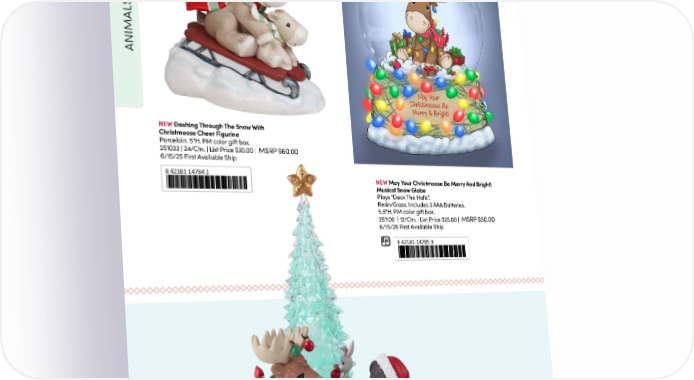 S ANIMAL NEW Dashing Through The Snow With Christmoose Cheer Figurine Porcelain. 5"H. PM color gift box. MSRP $60.00 251033 | 24/Ctn. | List Price $30.00 | 6/15/25 First Available Ship 8 42181 14784 2 NEW May Your Christmoose Be Merry And Bright! Musical Snow Globe Plays “Deck The Halls”. Resin/Glass. Includes 3 AAA Batteries. 5.5"H. PM color gift box. MSRP $50.00 251106 | 12/Ctn. | List Price $25.00 | 6/15/25 First Available Ship 8 42181 14785 9 It Moose Be Christmastime Lighted Figurine Resin/Acrylic. Includes 3 button cell batteries. 8"H. PM gift box. MSRP $45.00 231405 | 12/Ctn. | List Price $22.50 | 8 42181 13112 4 22