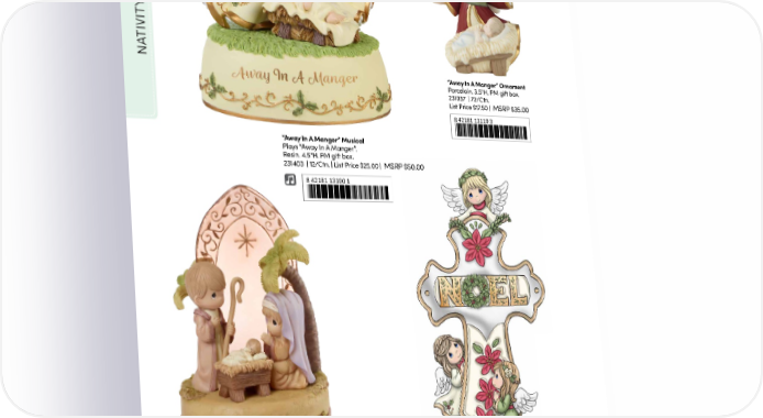 TIVITY NA “Away In A Manger” Ornament Porcelain. 3.5"H. PM gift box. 231037 | 72/Ctn. List Price $17.50 | MSRP $35.00 8 42181 13119 3 “Away In A Manger” Musical Plays “Away In A Manger”. Resin. 4.5"H. PM gift box. 231403 | 12/Ctn. | List Price $25.00 | MSRP $50.00 8 42181 13100 1 Unto Us A Child Is Born Musical Plays “O Holy Night”. NEW Joyeux Noel Cross Resin/Glass. 7"H. Photo retail box. Resin. 8.5"H. PM color gift box. MSRP $50.00 201110 | 12/Ctn. | List Price $25.00 | 251446 | 72/Ctn. | List Price $32.50 | MSRP $65.00 8 42181 11989 4 6/15/25 First Available Ship 8 42181 14932 7 18