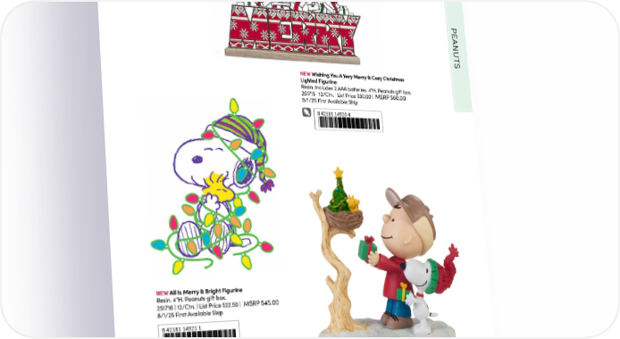 Lights up! PEANUT S NEW Wishing You A Very Merry & Cozy Christmas Lighted Figurine Resin. Includes 2 AAA batteries. 4"H. Peanuts gift box. 251715 | 12/Ctn. | List Price $30.00 | MSRP $60.00 8/1/25 First Available Ship 8 42181 14920 4 NEW All Is Merry & Bright Figurine Resin. 4"H. Peanuts gift box. 251716 | 12/Ctn. | List Price $22.50 | MSRP $45.00 8/1/25 First Available Ship 8 42181 14921 1 Christmas Is The Joy Of Giving Figurine Resin. 5"H. Peanuts gift box. 237406 | 12/Ctn. | List Price $25.00 | MSRP $50.00 8 42181 13543 6 © 2024 Peanuts Worldwide LLC 49