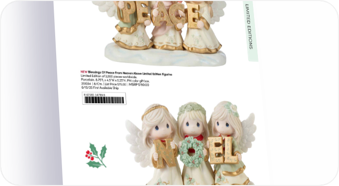 LIMITED EDITIONS NEW Blessings Of Peace From Heaven Above Limited Edition Figurine Limited Edition of 3,000 pieces worldwide. Porcelain. 8.75"L x 4.5"W x 5.25"H. PM color gift box. 251034 | 8/Ctn. | List Price $75.00 | MSRP $150.00 6/15/25 First Available Ship 8 42181 14786 6 Joyeux Noel Limited Edition Figurine Limited Edition of 3,000 pieces worldwide. Porcelain. 8.75"L x 4.5"W x 5.5"H. PM gift box. 231035 | 8/Ctn. | List Price $75.00 | MSRP $150.00 8 42181 13104 9 15