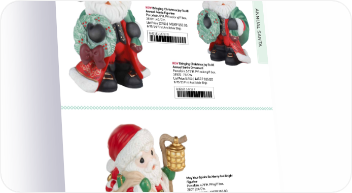 17th in Series ANNU NEW Bringing Christmas Joy To All Annual Santa Figurine AL Porcelain. 5"H. PM color gift box. 251011 | 40/Ctn. S MSRP $55.00 List Price $27.50 | ANT 6/15/25 First Available Ship 8 42181 14717 0 A NEW Bringing Christmas Joy To All Annual Santa Ornament Porcelain. 3.75"H. PM color gift box. 251012 | 72/Ctn. List Price $17.50 | MSRP $35.00 6/15/25 First Available Ship 8 42181 14718 7 May Your Spirits Be Merry And Bright Figurine Porcelain. 4.75"H. PM gift box. 211011 | 24/Ctn. MSRP $55.00 List Price $27.50 | 8 42181 12441 6 5