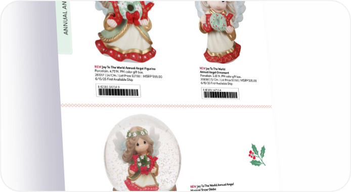 15th in Series ANGEL AL ANNU NEW Joy To The World Annual Angel Figurine NEW Joy To The World Porcelain. 4.75"H. PM color gift box. Annual Angel Ornament 251017 | 24/Ctn. | List Price $27.50 | Porcelain. 3.25"H. PM color gift box. MSRP $55.00 251018 | 72/Ctn. | List Price $17.50 | MSRP $35.00 6/15/25 First Available Ship 6/15/25 First Available Ship 8 42181 14714 9 8 42181 14715 6 NEW Joy To The World Annual Angel Musical Snow Globe Plays “Joy to the World”. Resin/Glass. 5.5"H. PM color gift box. 251103 | 12/Ctn. | List Price $25.00 | MSRP $50.00 6/15/25 First Available Ship 8 42181 14716 3 10