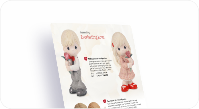 Presenting Everlasting Love. NEW I’ll Always Pick You Figurines Show your dearest love you would pick them over and over again with a rose-bearing figurine that perfectly captures your devotion. Bisque porcelain/Resin. 4.75"H. Boy | 242003 | $40.00 Girl | 242002 | $40.00 NEW Two Hearts One Voice Figurine Give the perfect karaoke-themed gift to the one who is the melody to your harmony, the one who encourages you to do brave, new things, and the one who will always be by your side through it all. Bisque porcelain. 5.25"H. 242005 | $75.00 NEW You’re My Sun When The Clouds Roll Through Figurine Arm-in-arm, this couple enjoys a stroll together, not letting the rain dampen their spirits. A truly unique figurine for your sweetheart, the umbrella and raindrops are designed with realistic detail. Bisque porcelain/Resin. 6.5"H. 242004 | $95.00 2 PreciousMoments.com | 866-336-2554