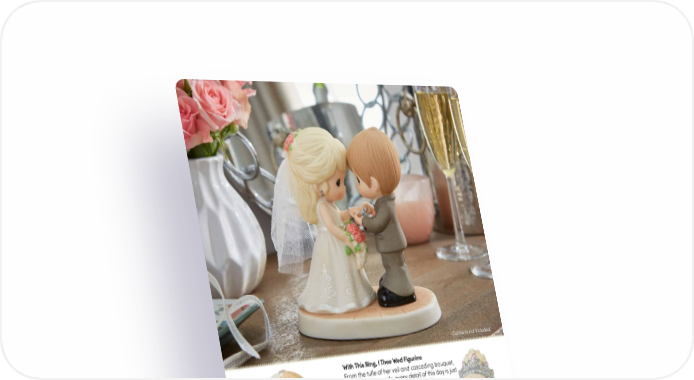 Contents not included. With This Ring, I Thee Wed Figurine From the tulle of her veil and cascading bouquet, to his sheepish smile, every detail of this day is just perfect. Bisque porcelain/Fabric. 5.5"H. Blonde (shown) | 222009 | $80.00 Brunette | 222009E | $80.00 Personalized | $86.00 Bride To Be Figurine This beautiful bride-to-be wears a sparkling pink dress, pearly shoes, and a tiara in honor of her upcoming nuptials. Celebrate the days leading up to the big event with a figurine that builds the growing excitement. Bisque porcelain. 6"H. 231047 | $45.00 Personalized | $51.00 To Have And To Hold Figurine This couple spends their Best Day Ever Musical wedding day on the shore. The bride and groom have said Bisque porcelain. 5.25"H. their vows and now they prepare 222030 | $80.00 to celebrate the rest of their lives Personalized | $86.00 together as he lifts her into the air with joy. Plays “Let Me Call You Sweetheart”. Resin. 6"H. 232109 | $45.00 10 PreciousMoments.com | 866-336-2554