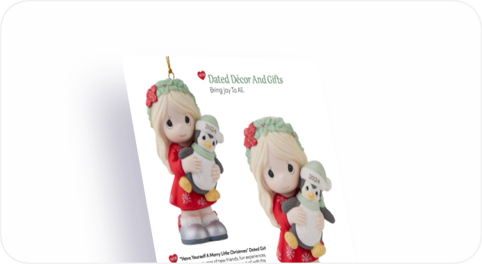 NEW Dated Décor And Gifts Bring Joy To All. NEW “Have Yourself A Merry Little Christmas” Dated Girl It has been a year of new friends, fun experiences, and unforgettable memories. Honor it all with this smiling young lady hugging a happy penguin wearing a hat adorned with “2024”. Bisque porcelain. Ornament | 3.5"H. | 241002 | $30.00 Figurine | 4.75"H. | 241001 | $50.00 NEW “Have Yourself A Merry Little Christmas” Dated Girl Ball Ornament Ball ornament includes a base for display anywhere. Bisque porcelain. 4.5"H. 241003 | $35.00 29