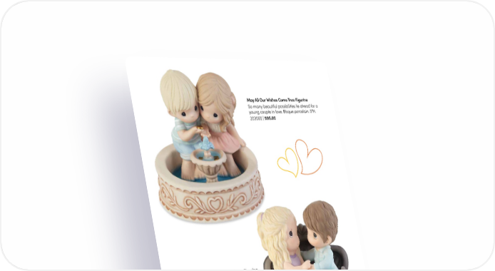 May All Our Wishes Come True Figurine So many beautiful possibilities lie ahead for a young couple in love. Bisque porcelain. 5"H. 203002 | $95.00 Founded In Faith, Joined In Love Figurine Blessed are those who have come together in faith. Side-by-side, this couple shares a tender moment as they sit on a beautiful wrought iron bench. Bisque porcelain. 5"H. 219013D Exclusive | $80.00 Love Is the Answer Figurine No matter the question, love is always the answer! Whatever challenges life brings, they are best faced with a partner beside you. This sweet couple knows that together they can accomplish anything. Bisque porcelain. 4"H. 203003 | $85.00 5