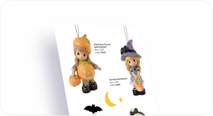 Trick Or Treat, You’re So Sweet Ornament Resin. 3.25"H. 211403 | $15.00 You’re Boo-tiful Ornament Resin. 3.25"H. 211402 | $15.00 I Love Spinning Time With You Ornament Much too cute to be spooky, this spidery sweetheart lifts her arms to show off her spiderweb cape. Tuck it into a trick-or-treat bag or hang from a Halloween tree. Resin. 3.25"H. I Love Spinning Time With You Figurine 231402 | $15.00 This darling girl won’t be spending too much time on the web, she will be out trick-or- treating. Bisque porcelain. 5.5"H. 229001 Exclusive | $55.00 13
