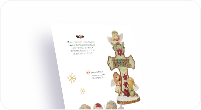 9 Joyeux Noel Cross Bisque porcelain. 8.5"H. 251446 | $75.00 NEW Blessings Of Peace From Heaven Above Limited Edition Figurine Limited to 3,000 pieces worldwide. Bisque porcelain. 8.75"L x 4.5"W x 5.25"H. 251034 | $160.00 NEW You Add That Heavenly Touch Figurine Bisque porcelain. 5.75"H. 259005 Exclusive | $70.00 NEW These heavenly messengers reflect the true meaning of Noelpeace on earth, joy to the world, and faith at the heart of it all.