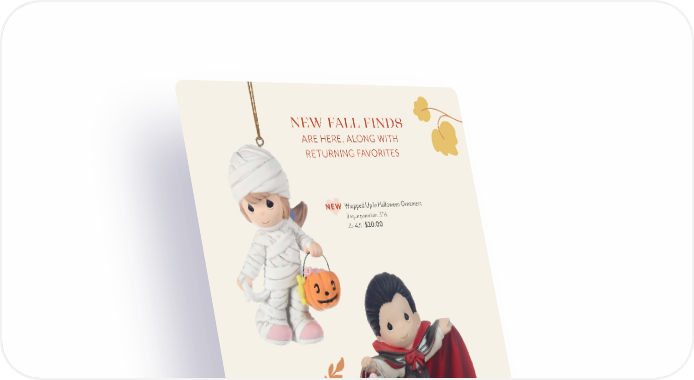 PreciousMoments.com | 866-336-2554 14 Happy Fall Yall Lighted Figurine Requires 3 button cell batteries, included. Resin. 6"H. 241405 | $50.00 Wrapped Up In Halloween Ornament Bisque porcelain. 3"H. 251421 | $20.00 NEW You Look Fang-tastic Figurine Bisque porcelain. 5.5"H. 259009 Exclusive | $60.00 NEW NEW FALL FI N D S ARE HERE, ALONG WITH RETURNING FAVORITES