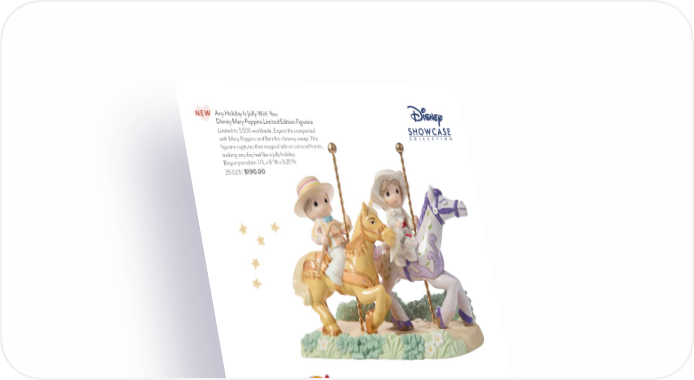You’re A Sensation Disney Dumbo Musical Timothy Q. Mouse convinces Dumbo he is indeed a sensation as they soar above the Big Top. This musical plays the tune “Entry of the Gladiators”. Resin. 5.5"H. 232110 | $60.00 Any Holiday Is Jolly With You Disney Mary Poppins Limited Edition Figurine Limited to 3,500 worldwide. Expect the unexpected with Mary Poppins and Bert the chimney sweep. This figurine captures their magical ride on carousel horses, making any day feel like a jolly holiday. Bisque porcelain. 11"L x 6"W x 9.25"H. 251023 | $190.00 NEW You’re My Wish Come True Disney Snow White Limited Edition Figurine Limited to 3,500 pieces worldwide. Disney’s very first princess and prince sparked a whole new genre of entertainment – full-length, animated feature films. This breathtaking Limited Edition figurine captures their magic meeting in front of the very well she made her wish to find true love. Bisque porcelain. 7.25"L x 6.5"W x 6.75"H. 242011 | $170.00 PreciousMoments.com | 866-336-2554 58