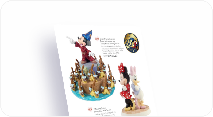 Love You To The Moon And Back Disney Mickey Mouse And Minnie Mouse Figurine Resin. 4.75"H. 231703 | $45.00 Best Friends Forever Disney Minnie Mouse And Daisy Duck Figurine Bisque porcelain. 5.75"H. 211701 | $90.00 $72.00 Celebrating In Style Disney Daisy Duck Figurine Celebrate any diva’s birthday with this iconic Daisy Duck figurine in sparkly clothes and accessories for her own 85th birthday. Resin. 5.75"H. 251708 | $45.00 NEW Dream A Fantastic Dream Disney 85th Anniversary Mickey Mouse Rotating Musical This musical figurine honors the 85th Anniversary of Disney’s Fantasia and plays “Sorcerer’s Apprentice”. Requires 3AAA batteries, included. Resin. 6.5"H. 251705 | $100.00 NEW PreciousMoments.com | 866-336-2554 54