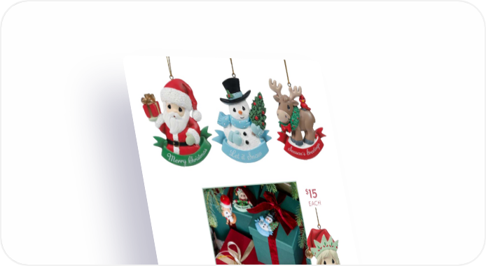 21 Merry Christmas Santa | 241418 Let It Snow Snowman | 241419 Season’s Greetings Reindeer | 241425 Happy Holidays Elf | 241420 Peace On Earth Angel | 241421 The First Noel Nativity | 241422 $15 EACH Add a thoughtful touch to every gift with these flat ornaments featuring a “to/from” space on the back—perfect for personalizing or using as festive gift tags. Hand-painted and crafted in resin, each 2.75" ornament adds charm to any holiday tree.