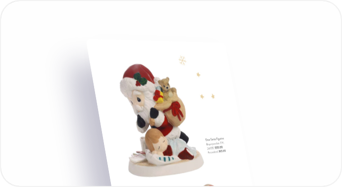 9 Merry Christmas To All Mini Figurine Resin. 3"H. 231409 | $20.00 Dear Santa Figurine Bisque porcelain. 5"H. 241035 | $95.00 Personalized | $101.00 Santa’s On His Way Figurine Bisque porcelain. 5.25"H. 211041 | $65.00 $38.50