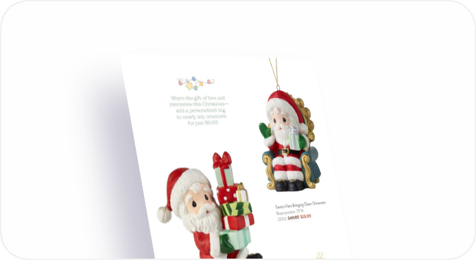 PreciousMoments.com | 866-336-2554 8 Santa’s Here Bringing Cheer Ornament Bisque porcelain. 3.5"H. 231012 | $40.00 $28.00 Loaded Up With Christmas Cheer Figurine Bisque porcelain. 5.5"H. 221011 | $65.00 $41.25 Santa’s Here Bringing Cheer Figurine Bisque porcelain. 4.5"H. 231011 | $65.00 $44.00 Share the gift of love and memories this Christmas— add a personalized tag to nearly any ornament for just $6.00!