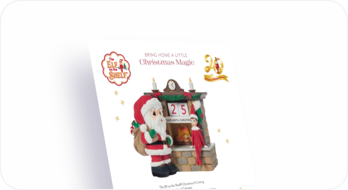 PreciousMoments.com | 866-336-2554 50 The Elf on the Shelf® You Make Christmas Come To Life Figurine Resin. 4.75"H. Girl | 241042 | $60.00 Boy | 241044 | $60.00 ®/TM/© 2025 CCA and B, LLC d/b/a The Lumistella Company. All Rights Reserved. BRING HOME A LITTLE Christmas Magic The Elf on the Shelf® Christmas Is Coming Lighted Countdown Calendar Count down the days until Santa’s visit with this fun countdown calendar. Changing the days each morning becomes its own holiday tradition that little ones and older kids alike look forward to each December day. Includes 3 button cell batteries. Resin. 4.5"H. 241424 | $60.00