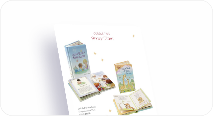 CUDDLE TIME Story Time 49 Storybook Bible Hard Cover 196 pages. 1599-4 | $20.00 Little Book of Baby Animals 32-page board book. 7.5"H. 2475-3 | $10.00 Little Book Of Bible Stories 32-page board book. 5" x 7". 9763-9 | $10.00