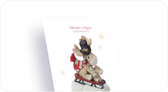 19 May Your Christmoose Be Merry And Bright! Lighted Musical Snow Globe Plays “Deck The Halls”. Requires 3 AAA batteries, included. Resin/Glass. 5.75"H. 251106 | $55.00 NEW Moose-t Have CHRISTMAS GIFTS Dashing Through The Snow With Christmoose Cheer Figurine Bisque porcelain. 5"H. 251033 | $65.00 NEW