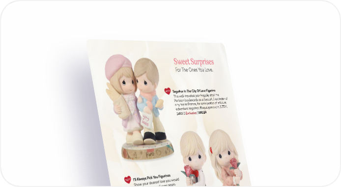 Sweet Surprises For The Ones You Love. NEW Together In The City Of Love Figurine This well-traveled pair happily stroll the Parisian boulevards as a beautiful reminder of any trip to France, for anticipation of a future adventure together. Bisque porcelain. 5.75"H. 249013 Exclusive | $90.00 NEW I’ll Always Pick You Figurines Show your dearest love you would pick them over and over again with a rose-bearing figurine that perfectly captures your devotion. Bisque porcelain/Resin. 4.75"H. Boy | 242003 | $40.00 Girl | 242002 | $40.00 Special Offer YOURS FOR ONLY $ .50 with purchase of 17 $30.00 or more. ($35.00 Retail Value) Together We Are Happy Campers Lighted Figurine This unique LED figurine is a touching way to show a nature lover in your life how much joy and comfort they bring you. Resin. Includes 3 button cell batteries. 4.5"H. 239401 | $35.00 $17.50 2 PreciousMoments.com | 866.336.2554