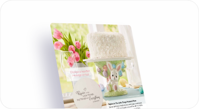 Displays a heartfelt message on top! Contents not included. Rejoice In The Little Things Pedestal Plate Serve delicious treats as you and your loved ones rejoice in all things Easter around the dinner table. This plate is perfect for desserts or appetizers. Ceramic. 11" dia. x 6"H. Hand wash only. 192401 | $51.00 $17.50 NEW Angeled Eggs Easter Bunny Shakers A pair of angeled egg salt and pepper shakers are all decked out for Easter, with no deviled eggs in sight, to add whimsy to any Easter table. Ceramic. 3.5"H. Hand wash only. 242414 | $15.00 Angeled Eggs Platter Uniquely designed, this platter has 12 angelic, chick-shaped indents for your hard-boiled delicacies that ensures deviled eggs will be served at every gathering! Ceramic. 10" dia., Hand wash only. 242418 | $25.00 Back by popular demand! 3