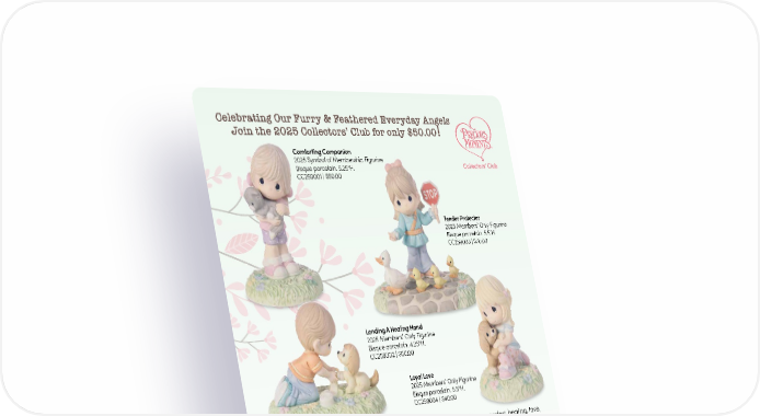 Celebrating Our Furry & Feathered Everyday Angels ! Join the 2025 Collectors’ Club for only $50.00 Comforting Companion 2025 Symbol of Membership Figurine Bisque porcelain. 5.25"H. CC259001 | $50.00 Tender Protector 2025 Members’ Only Figurine Bisque porcelain. 5.5"H. CC259003 | $70.00 Lending A Healing Hand 2025 Members’ Only Figurine Bisque porcelain. 4.25"H. CC259002 | $60.00 Loyal Love 2025 Members’ Only Figurine Bisque porcelain. 5.5"H. CC259004 | $40.00 NEW This year’s Collectors’ Club is in celebration of the pets that provide us comfort, healing, love, and comic relief. From their playful antics to their unparalleled devotion, animals really are angels on Earth. Membership includes a Symbol of Membership Figurine and the exclusive opportunity to purchase an additional three Members’ Only Figurines. Membership also makes a thoughtful gift that lasts for one full year. Club CLUB MEMBER EXCLUSIVE BENEFITS 2025 • FREE Symbol of Membership Figurine Comforting Companion • EXCLUSIVE ability to purchase three 2025 Members’ Only Figurines • FREE one-year digital subscription to MOMENTS Magazine, the ® ofÏcial publication of the Precious Moments Collectors’ Club † • FREE shipping on eligible purchases † • FREE figurine and doll personalization on eligible products • EXCLUSIVE earn Share Love Rewards Points three times faster than non-Members, for rewards to spend on future purchases! • INVITATION to join the ofÏcial Club Facebook group for exclusive giveaways, pre-orders, and new product sneak peeks! 3 WAYS TO PURCHASE YOUR CLUB MEMBERSHIP Catalog order form Call 1-877-496-8725 Visit PreciousMoments.com/Collectors-Club-Information **Restrictions apply. Visit www.PreciousMoments.com/promotion_club2025 for details. †Valid on eligible purchases made through PreciousMoments.com and Precious Moments Mail Order Division. 15