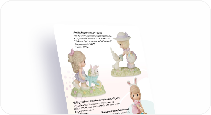 I Find You Egg-straordinary Figurine Sharing an egg from her own Easter basket, this springtime cutie is dressed in her Sunday best. This Easter figurine makes a perfect hostess gift. Bisque porcelain. 5.25"H. 239023 | $50.00 Wishing You Bunny Kisses And Springtime Wishes Figurine This cutie wheels flowers and bunnies to a spring celebration. Makes a great centerpiece for Easter dinner! Bisque porcelain. 5.5"H. 222015 | $60.00 Wishing You A Hoppy Easter Musical Spring is a time of joyful celebration. Add a spring to your step this season with an Easter-themed musical that plays “The Entertainer”. Resin. 6"H. 232107 | $40.00 Oh Hoppy Day Floppy Bunny Stuffed Animal Plush. 8.5"H. White | A15753 | $14.00 Grey | A15776 | $14.00 4 PreciousMoments.com | 866.336.2554
