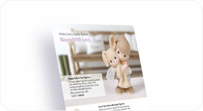 Make Every Easter Basket Bloom With Love. Happy Tails To You Figurine A happy greeting and a good squeeze are sometimes all you need. Wish someone well and make them smile with this adorable figurine. Bisque porcelain. 4"H. 199007 | $35.00 Count Your Many Blessings Figurine Remind someone dear that their blessings are as plentiful as jellybeans at Easter time. Bisque porcelain. 4"H. 199008 | $35.00 You’re Some Bunny Special Musical Snow Globe Let someone know that they are "some bunny" special this Easter season. Plays “The Entertainer”. Resin/Glass. 5.5"H. 222101 | $40.00 5