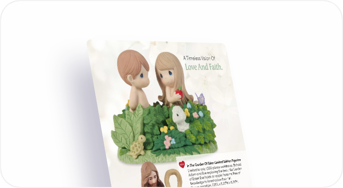 A Timeless Vision Of Love And Faith. NEW In The Garden Of Eden Limited Edition Figurine Limited to only 1,500 pieces worldwide. Behold Adam and Eve exploring the beautiful Garden of Eden! Eve holds an apple from the Tree of Knowledge to foreshadow their fall. Bisque porcelain. 7.25"L x 5.25"W x 5.75"H. 249014 Exclusive | $140.00 The Lord Is My Shepherd Limited Edition Figurine Limited to only 1,500 pieces worldwide. Encourage your family and friends to honor Jesus and celebrate His eternal love with Easter décor you’ll be proud to display year after year. Bisque porcelain. 5.75"L x 5.25"W x 9.5"H. 199010 Exclusive | $130.00 10 PreciousMoments.com | 866.336.2554