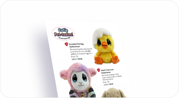 NEW Scrambled Chick Egg Stuffed Animal This charming chick may be a bit out of sorts, but is an adorable addition to any Easter egg hunt! Plush. 7"H. 246833 | $10.00 NEW Serbet Tie Dye Lamb Stuffed Animal Her tie dye coloring makes a super unique touch for an Easter morning surprise. Plush. 7"H. 246830 | $10.00 NEW Doc Bunny Stuffed Animal This floppy-eared cutie with her oversized carrot make a unique addition to any Easter basket! Plush. 7"H. 246832 | $10.00 The Joy Of Easter Hardcover book. 8"W x 8"H. 32 pages. SB5692-0 | $10.00 9