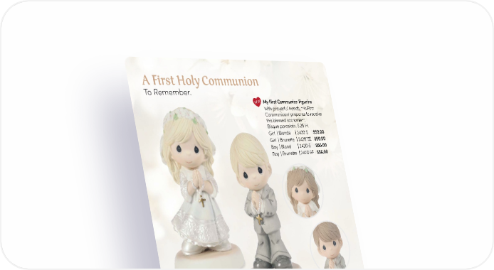 A First Holy Communion To Remember. NEW My First Communion Figurine With prayerful hands, this First Communicant prepares to receive this blessed sacrament. Bisque porcelain. 5.25"H. Girl | Blonde | 242015 | $50.00 Girl | Brunette | 242015E | $50.00 Boy | Blond | 242016 | $50.00 Boy | Brunette | 242016E | $50.00 NEW My First Communion Photo Frame Showcase a lovely photo from her First Communion day within this pretty photo frame trimmed with pink flowers. It displays a 4" x 6" photo. Resin/Glass. 8.5"H. 242413 | $30.00 11