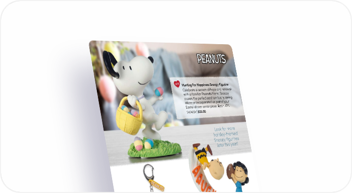 NEW Hunting For Hoppiness Snoopy Figurine Celebrate a season of hope and renewal with a familiar Peanuts friend. Snoopy makes the perfect addition to any spring décor or incorporated as part of your Easter dinner centerpiece. Resin. 4"H. 242439 | $25.00 Look for more holiday-themed Snoopy figurines later this year! NEW Peanuts Never Give Up Figurine Charlie Brown once again finds himself missing the kick as Lucy holds the football. Surely, one day, he will make it! This figurine makes a perfect gift to brighten someone's Peanuts Snoopy Backpack Clip day knowing they should never give up! Add a little bit of Snoopy's mischievous Resin. 4.5"H. personality to any backpack or bag with this 242444 | $50.00 durable backpack clip. The perfect addition to the Easter basket of a Snoopy fan! Vinyl/Metal. 2"H. 239706 | $6.00 Never Give Up Photo Frame The recurring theme of Lucy and Charlie Brown’s football antics plays out on this photo frame. Showcase a 4" x 6" sports photo or picture of a hard-earned achievement with this amusing Peanuts gift. Resin/Glass. 5.5"H. 241708 | $40.00 14 PreciousMoments.com | 866.336.2554 © 2024 Peanuts Worldwide LLC | WWW.PEANUTS.COM