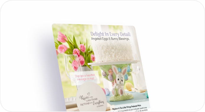 Delight In Every Detail: Angeled Eggs & Bunny Blessings. Displays a heartfelt message on top! Contents not included. Rejoice In The Little Things Pedestal Plate Serve delicious treats as you and your loved ones rejoice in all things Easter around the dinner table. This plate is perfect for desserts or appetizers. Ceramic. 11" dia. x 6"H. Hand wash only. 192401 | $51.00 $17.50 NEW Angeled Eggs Easter Bunny Shakers A pair of angeled egg salt and pepper shakers are all decked out for Easter, with no deviled eggs in sight, to add whimsy to any Easter table. Ceramic. 3.5"H. Hand wash only. 242414 | $15.00 Angeled Eggs Platter Uniquely designed, this platter has 12 angelic, chick-shaped indents for your hard-boiled delicacies that ensures deviled eggs will be served at every gathering! Ceramic. 10" dia., Hand wash only. 242418 | $25.00 Back by popular demand! 8 PreciousMoments.com | 866.336.2554