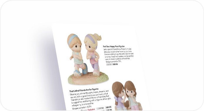 Find Your Happy Pace Figurine Let a special friend know there is no one else you would rather have by your side. Forever willing to go the extra mile for one another, these two besties are the perfect way to honor a precious friendship. Bisque porcelain. 5"H. 232020 | $60.00 That’s What Friends Are For Figurine Sharing your inner thoughts, hopes, dreams, and secrets with a good friend you can trust is what friendships are made of. Honor a friendship that is supportive and loving with a figurine of two girls whispering to one another. Bisque porcelain. 5.5"H. Brunette/Blonde Exclusive | 239019A | $80.00 Brunette (shown) Exclusive | 239019B | $80.00 Exclusive | 239019C | $80.00 Blonde Personalized | $86.00 Here’s To A Lifetime Of Friendship Photo Frame Raise a glass to a special friendship that stands the test of time. Holds 4" x 6" photo. Resin/Glass. 8.25"H. 223405 | $35.00 13
