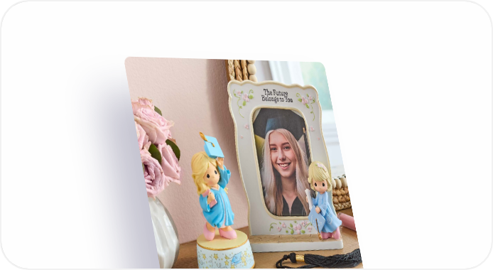 11 The Future Belongs To You Graduation Photo Frame Let her showcase a photo from the day her next chapter begins. This beautiful frame with a figural graduate displays a 4" x 6" photo. Resin/Glass. 8.25"H. 242429 | $35.00 NEW Find a heartfelt keepsake that truly represents your loved ones. Each sold separately. Contents not included. From Cap And Gown To New Horizons Graduation Musical This happy graduate shares her pure joy at the completion of all her hard work. Tossing her cap into the air, she knows she is on the right path to success. Plays Pomp and Circumstance. Includes 3 AAA batteries. Resin. 6.5"H. Blonde/Black Gown | 242103 | $40.00 Blonde/Blue Gown (shown) | 242103E | $40.00 Red Hair/Blue Gown | 242103F | $40.00 Red Hair/Black Gown | 242103G | $40.00 Brunette/Black Gown (shown) | 242103H | $40.00 Brunette/Blue Gown | 242103J | $40.00 NEW