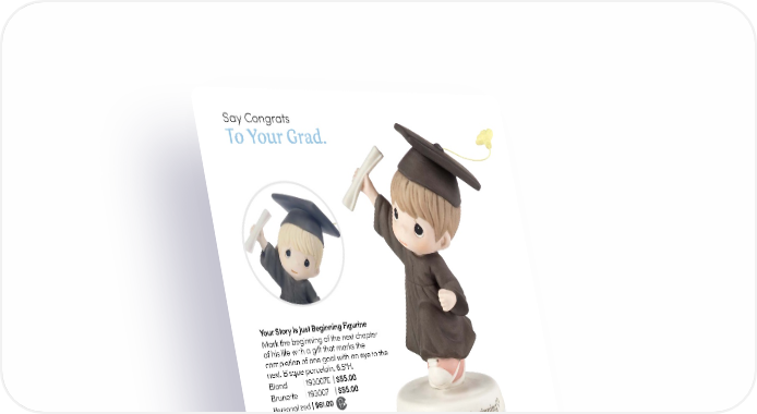 PreciousMoments.com | 866.336.2554 10 Say Congrats To Your Grad. Your Story Is Just Beginning Figurine Mark the beginning of the next chapter of his life with a gift that marks the completion of one goal with an eye to the next. Bisque porcelain. 6.5"H. Blond | 193007E | $55.00 Brunette | 193007 | $55.00 Personalized | $61.00 The Future Belongs To You Figurine So full of potential, a graduate in her cap and gown clutches her diploma with a sense of accomplishment. Bisque porcelain. 5.75"H. Brunette/Black Gown | 183007G | $55.00 Blonde/Blue Gown | 183007F | $55.00 Personalized | $61.00