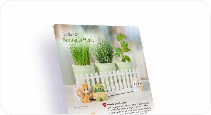 PreciousMoments.com | 866.336.2554 6 Seeds Of Love Planter Set Give this planter set to friends or family as a birthday gift, a Mothers Day present, or simply to wish them a happy growing season. Anyone who enjoys gardening or cooking with fresh herbs will be honored to receive this sweet set of herb planters! Wood, ceramic, and resin. 9 " L x 4.25 " H. 242410 | $35.00 Just Bee Yourself Figurine Encourage someone to bee themselves and have confidence in who they are with this uplifting figurine. Bisque porcelain. 5.5"H. 232038 | $45.00 Grow A Little Every Day Perpetual Calendar Offer encouragement to keep growing through all of lifes seasons with this beautiful calendar that can be used year after year. Resin. 4.5"H. 229018 Exclusive | $40.00 The Best Of Spring Is Here. Contents not included. NEW