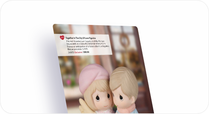 Join the Precious Moments 2025 Collectors Club for exclusive Member benefits that last an entire year. Visit www.preciousmoments.com/collectors-club-information/ for more information. Together In The City Of Love Figurine This well-traveled pair happily stroll the Parisian boulevards as a beautiful reminder of any trip to France or anticipation of a future adventure together. Bisque porcelain. 5.75"H. 249013 Exclusive | $90.00 NEW